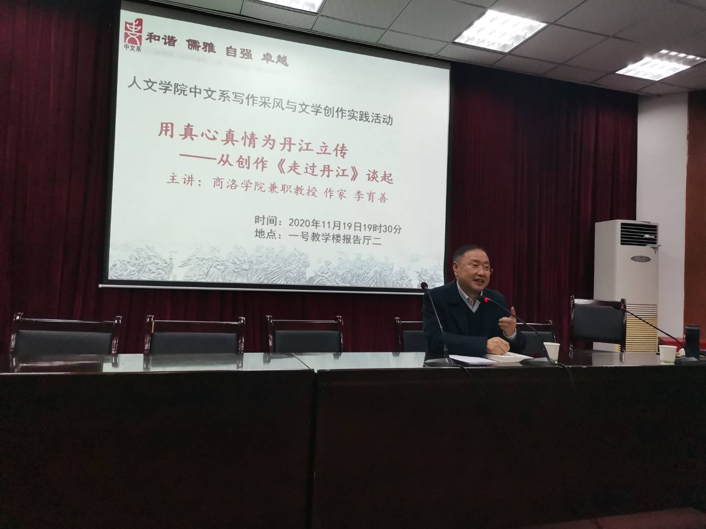 李育善先生是丹凤县棣花人,《走过丹江》是他的第四部散文集。他首先为同学们介绍了接下来要行走的棣花、龙驹寨和四皓遗址,重点讲述了走丹江和写丹江这两个重要的创作环节,阐述了行走的意义。结合创作实践,说明了散文写作的特点,最后寄语大学生在今后的学习生活中要开阔思维,勤于练笔,学有所成。李育善先生深入浅出、通俗易懂、幽默风趣的报告,受到了学生们的欢迎和好评。