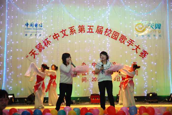 经过初赛复赛选拔而来的10位选手,以他们优美的歌声和舞蹈,为现场师生带来了一场视觉和听觉上的唯美盛宴。《灰色空间》、《山路十八弯》、《蝴蝶花》、《青春日记》以及颇具民族特色的《翻身农奴把歌唱》等一首首或青春或婉转的校园歌曲和流行歌曲丰富了比赛内容,加上我系新成立的学生乐队也为歌手大赛助兴,使整场晚会异彩纷呈。