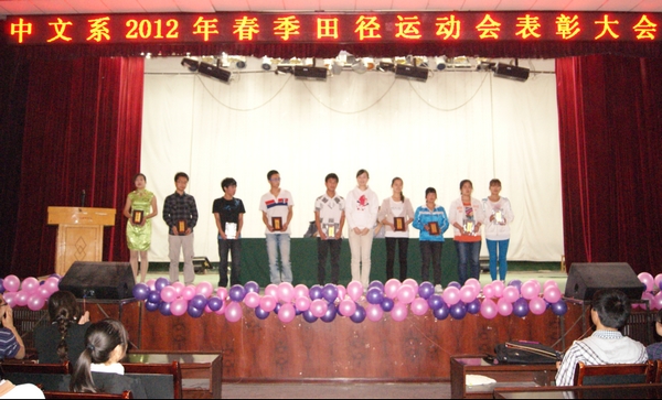 ,我系对在2012春季田径运动会中表现突出的侯婷婷等19名杰出运动员、张涛等29名优秀运动员、李军等15名优秀组织者、安阳等13名优秀志愿者、吴汉鹏等23名优秀宣传者进行了表彰。副主任杨军,团总支书记黄璜,辅导员李斌、付栋等参加表彰仪式并为获奖代表颁奖。我系副主任刘勇主持大会。