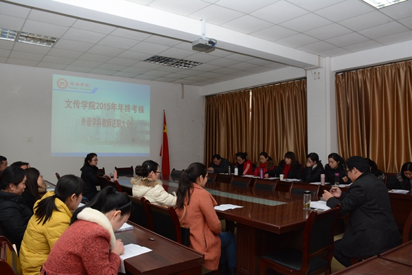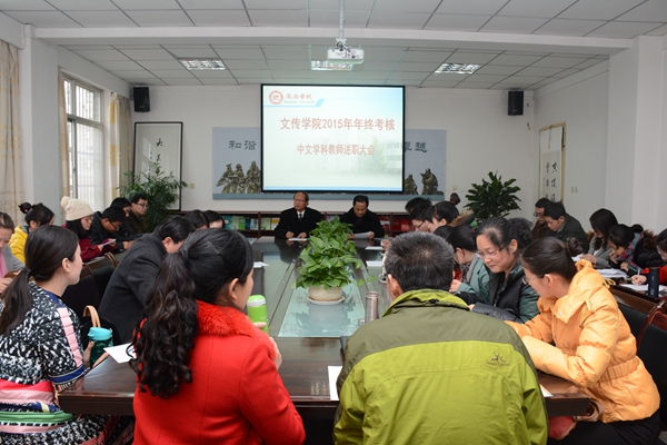 考核会结束后,我院分中文学科、外语学科进行了年度述职,院长黄元英、党总支书记王正良分别参加述职会。全院教师从思想政治、教学科研、学生管理等方面对2015年工作进行了总结。