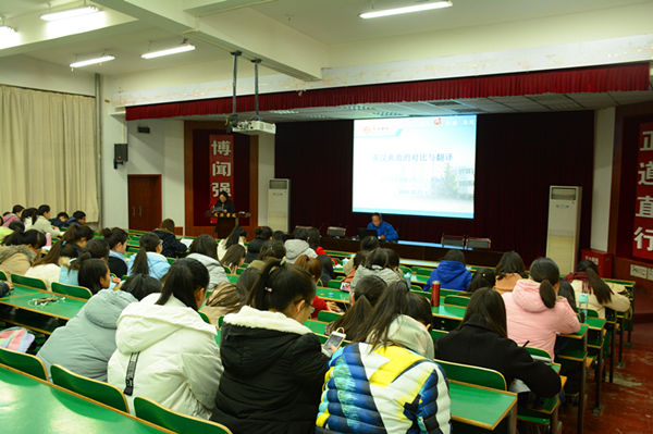12月21日,我院党总支书记王正良教授在一号教学楼报告厅二作了题为《英汉典故的对比与翻译》的报告。我院英语专业全体学生参加了报告。