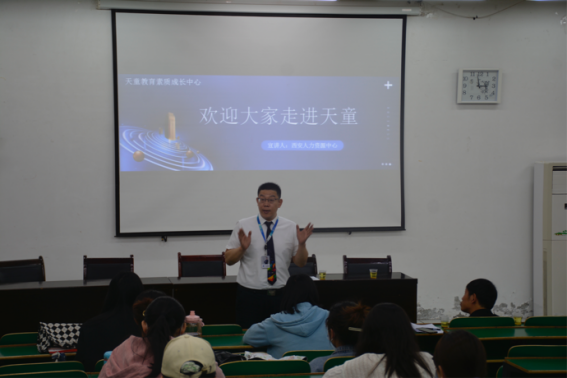 西安天童美语培训中心人事主管介绍公司的成长体系、福利待遇以及为我校毕业生提供好岗位。同时希望更多的优秀毕业生投身教育行业,表达对我院学子投身其岗位的期待。